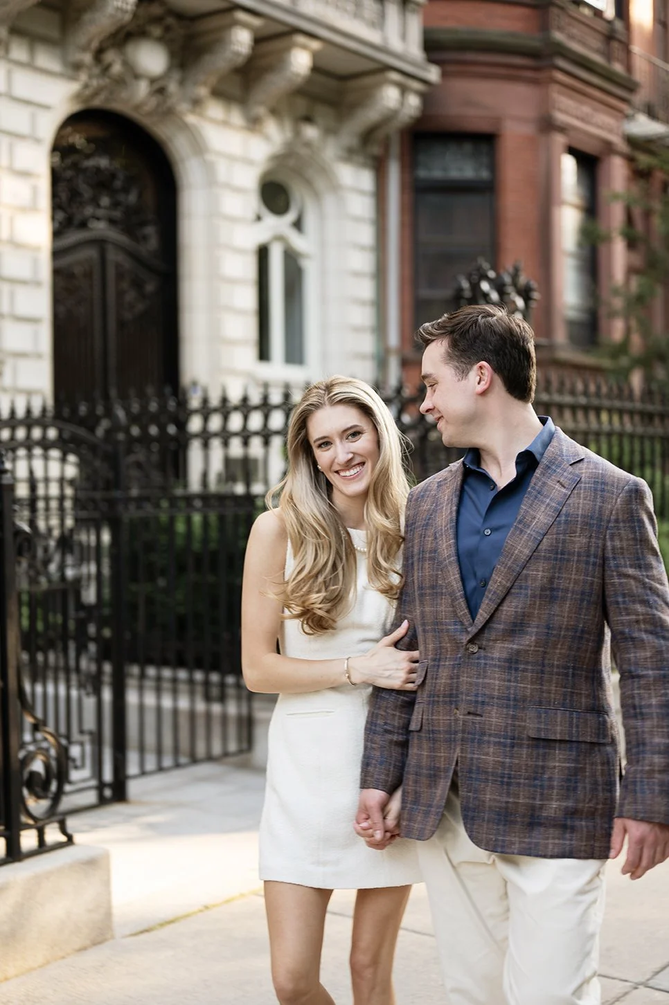 From there, we wandered through Commonwealth Avenue and into Beacon Hill. The tree-lined paths, historic brownstones, and iron fences gave the session a romantic, storybook quality. This part of Boston always feels intimate and full of character, and it was the perfect place to capture their playful, affectionate side. Cathryn and Brendan held hands as they strolled along the sidewalks, pausing on quiet corners and sunlit crosswalks, completely in their own world.